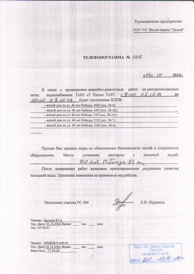 07.10.2024 с 09:00 до 20:00 телефонограмма №106 от 03.10.2024.Тел. 67-55-41, 33-30-60