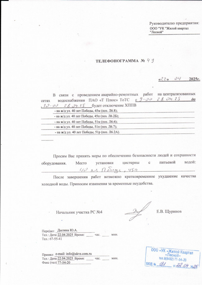 согласно телефонограмме ПАО Т Плюс №49 от 22.04.2025 планируется отключение ХППВ - хозяйственно-питьевого противопожарного водоснабжения (холодной воды). Место установки цистерны с питьевой водой - ул. 40 лет Победы. 45П.